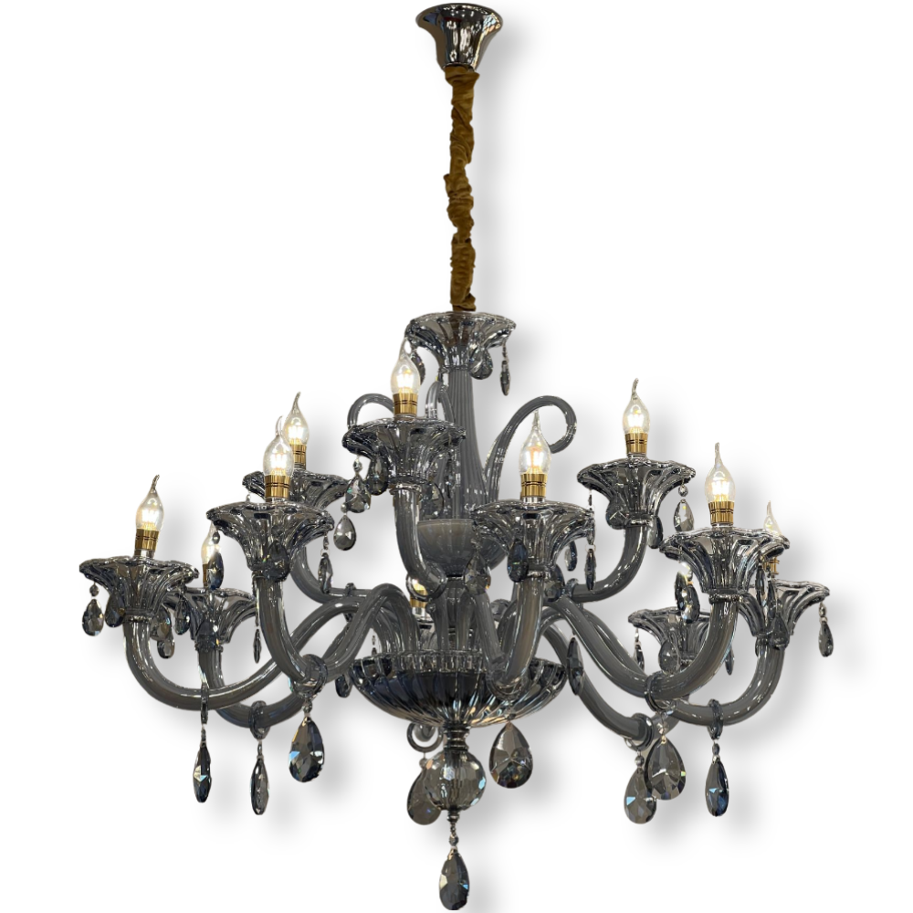 Sublimez votre intérieur avec ce magnifique lustre en verre doré, conçu pour apporter une ambiance chaleureuse et luxueuse à n’importe quelle pièce. Doté de multiples bras finement travaillés, il présente des coupelles sculptées et des pampilles étincelantes qui captent la lumière avec élégance. Les ampoules en forme de flamme renforcent son charme classique et créent une atmosphère raffinée.